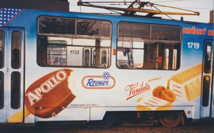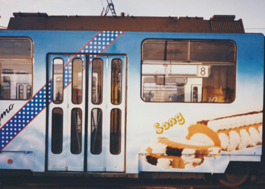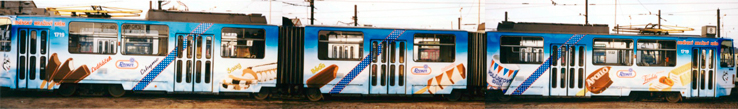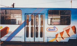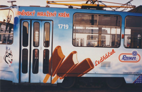 Návrh reklamního potisku tramvaje s použitím autorské grafiky a obrázků.
